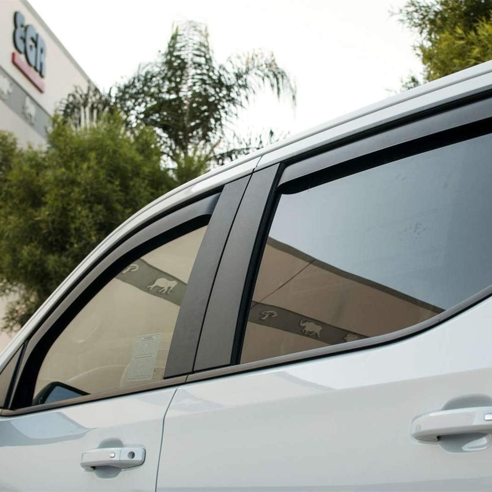 EGR DARK SMOKE In-Channel Window Visors are designed to promote fresh air circulation inside the vehicle. These fully integrated, custom molded designs help to reduce windshield fogging in wet weather for safer driving, and can lower interior temperatures in parked vehicles.á The UV protectedá finish is easy to clean.. Limited lifetime warranty. FRONT & REAR SET.