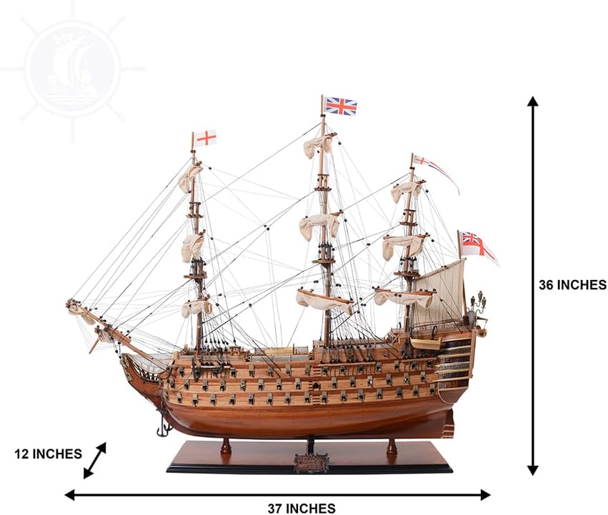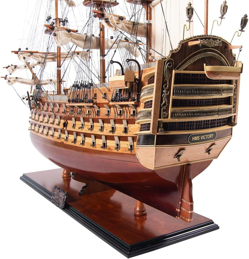 H.M.S. Victory, Adm. Horatio Nelson’s flagship at the Battle of Trafalgar in 1805, is now available as a museum-quality, FULLY ASSEMBLED model. This is an “Exclusive Edition” where the model has a unique serial number etched into the hull, which allows us to identify production date, the material used and all other production information of a model. Master craftsmen using historical photographs, drawings or original plans meticulously handcraft these highly detailed wood models from scratch. They are built to scale with high-grade wood such as western red cedar, rosewood, and mahogany. They are 100% hand built individually using plank-on-frame construction method and are similar to the building of actual ships. Each model requires hundreds of hours to finish and must go through a demanding quality control process before leaving the workshop. This amazing replica of the H.M.S. Victory model features plank on frame, three decks, and three ferocious rows of metal cannons on each side of the ship. The front bowsprit and three large masts are connected securely using advanced rigging and lines painstakingly knotted and fastened by hand. Each yard has an attached hand-stitched rolled-up sail made of fine linen. Metal anchors and a wooden rudder are visible on the front and rear of the ship. On the deck, there are authentic hand-built lifeboats with ribs and planks, stationed metal cannons, metal steering wheels, wooden crane, captain’s dining and sleeping cabin, and many other handcrafted ornaments. There is also an exquisite detailed admiral’s quarter on the stern with beautiful metal lanterns, handcrafted brass statues and ornaments, and a wooden flagpole. This model comes standard with a solid wood base and brass nameplate. It’ll make a perfect gift for home or office decorator, boat enthusiast or passionate collector.